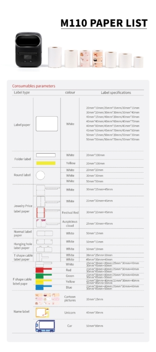 M110 Label Printer- Mini Portable Bluetooth Thermal Label Maker Apply to Labeling, Office, Cable, Retail, Barcode and More, Compatible with Android & iOS System.